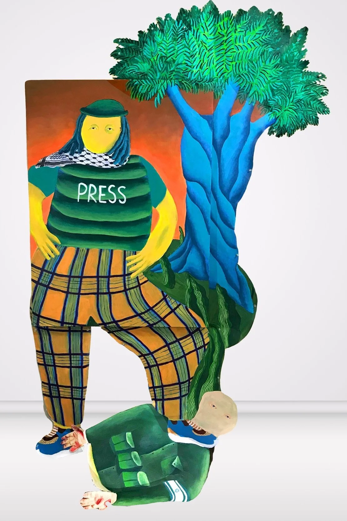 There is no justice for Shireen Abu Akleh, no justice for the 45 Palestinian journalists, and no justice for any of our martyrs—because there can be no justice for the dead. This painting envisions the only conceivable justice: for Shireen Abu Akleh and all our martyrs to have lived long enough to stand over the corpses of their killers.